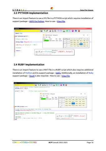 Data File Viewer%uf09f %uf09f RCP Consult 2022-2025 Page 102.3 PYTHON ImplementationThere is an import feature to use a H5-File in a PYTHON script which requires installation of support package %u2013 HDF5 for Python. How to use %u2013 h5py.File.2.4 RUBY ImplementationThere is an import feature to use a MAT-File in a RUBY script which also requires additional installation of Python and its support package %u2013 HDF5. Additionally, an installation of Rubysupport package %u2013 Pycall is also required. How to use %u2013 h5py.File.