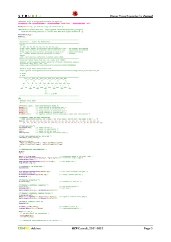 Planar Truss Examplefor ComrelAdd-onRCPConsult, 2021-2025Page 3(*# Global flags to manage plot facilities of engine *)StrurelPlot=True;StrurelPlotMode=3;StrurelPlotName=\_\StrurelPlotType=\Needs[\(*! Activate usage of external dll *)(*# Code based on Max Ehre work https://github.com/maxehre/polynomial_surrogatesUsed with his kind permission as version from 2017 that adapted to Strurel. *)PlanarTruss[XP_]:=Module[{},(*============================================================================Planar Truss Example for Mathematica============================================================================Inputs:X = [A1, A2, E1, E2, P1, P2, P3, P4, P5, P6, uy]E1,E2: Youngs modulus of horizontal and inclined bars resp. -log-normally distributedA1,A2: cross section of horizontal and inclined bars resp. -log-normally distributedP1-P6: negative vertical forces attacking in nodes 8-13. -Gumbel distributeduy: maximal allowed vertical deflection in node 4. constantOutput:uout: vertical truss deflection at bottom center (N04)============================================================================Truss description taken from Lee, S.H., Kwak, B.M. (2006).Response surface augmented moment method for efficient reliability analysis.Structural Safety 28(3), 261 272.https://www.sciencedirect.com/science/article/abs/pii/S0167473005000421Based on Diego Andr%u00e9s Alvarez Mar%u00edn work https://github.com/diegoandresalvarez/elementosfinitos/tree/master/codigo/repaso_matricial/cercha_2dN: NodesR: Rods============================================================================N13__R4___N12__R8___N11__R12__N10__R16__N09__R20__N08/\\/\\/\\/\\/\\/\\/ \\/ \\/ \\/ \\/ \\/ \\R1 R3 R5 R7 R9 R11 R13 R15 R17 R19 R21 R23/ \\/ \\/ \\/ \\/ \\/ \\/___R2___\\/___R6___\\/__R10___\\/__R14___\\/__R18___\\/__R22___\\N01 N02 N03 N04 N05 N06 N07||\\/uout => uy @ N04============================================================================*)(*#---------------------------------------------------------------------------# Planar truss model#*)(*# Vector inputs -order from Stochastic Model *)A1=XP[[1]];(*! cross section of horizontal bars *)A2=XP[[2]];(*! cross section of inclined bars *)E1=XP[[3]];(*! Youngs modulus of horizontal bars *)E2=XP[[4]];(*! Youngs modulus of inclined bars *)P=XP[[5;;10]];(*! negative vertical forces attacking in nodes 813. (1x6 vector) *)(*# Element, nodes and dofs association# IEN: connectivity matrix, nfe x nodes -bar 1 has nodes 1 and 13, bar 2 has nodes 1 and 2 ... *)IEN={{1,13},{1,2},{13,2},{13,12},{2,12},{2,3},{12,3},{12,11},{3,11},{3,4},{11,4},{11,10},{4,10},{4,5},{10,5},{10,9},{5,9},{5,6},{9,6},{9,8},{6,8},{6,7},{8,7}};(*# FEM constants *)nfe=Length[IEN];(*! number of bars *)nnp=13;(*! number of nodal points *)ned=2;(*! number of dof per node *)ndof=nnp*ned;(*! number of degrees of freedom (dof) *)(*# LM: localization matrix, nfe x dof *)LM=Table[0,{nfe},{2*ned}];For[n=1,n<=nfe,n++,LM[[n,1]]=IEN[[n,1]]*ned-1;LM[[n,2]]=IEN[[n,1]]*ned;LM[[n,3]]=IEN[[n,2]]*ned-1;LM[[n,4]]=IEN[[n,2]]*ned;];(*# Deterministic rod properties *)grid=4;ng=12;ang=ArcTan[grid,grid];(*! inclination angle of the truss [deg] *)theta=Flatten[ConstantArray[{ang,0,ang,0},ng/2]];(*! inclination angle [deg] *)theta=Delete[theta,1];leng=Flatten[ConstantArray[{4/Sqrt[2],4},ng]];(*! bar length [m] *)leng=Delete[leng,-1];(*# Stochastic rod properties *)Unprotect[E];area=Flatten[ConstantArray[{A2,A1},ng]];(*! bar cross sectional area [m2] *)area=Delete[area,1];E=Flatten[ConstantArray[{E2,E1},ng]];(*! Young's modulus [N/m^2] *)E=Delete[E,-1];(*# Material properties *)k=E*area/leng;(*! stiffness of each bar *)(*# Boundary conditions (supports) *)cc={1,2,14};(*! dof fixed/supports *)dd=Range[ndof];(*! dof free *)For[n=Length[cc],n>0,n--,dd=Delete[dd,cc[[n]]];];(*# Boundary conditions (applied forces) *)fc=Array[0&,ndof];For[n=1,n<=Length[P],n++,fc[[14+2*n]]=P[[n]];];(*! negative vertical forces [N] *)For[n=Length[cc],n>0,n--,fc=Delete[fc,cc[[n]]];];(*# Global stiffness matrix *)Unprotect[K];K=Table[0,{ndof},{ndof}];(*! stiffness matrix *)T=Array[Table[0,{4},{4}]&,nfe];(*! transformation matrix *)For[n=1,n<=nfe,n++,(*! sin and cos of the inclination *)c=Cos[theta[[n]]];s=Sin[theta[[n]]];(*! coordinate transformation matrix for the bar n *)