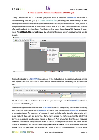 Interface to FORTRAN%uf09f %uf09f RCP Consult 2023-2025 Page 117. How to use the Fortran interface in a STRUREL jobDuring installation of a STRUREL program with a licensed FORTRAN Interface a corresponding Add-on (SAO) %u2013 StrurelToFortran.sao providing the connectivity to the development environment for supported compilers will be placed in the \\Add-ons\\ folder. If everything has been bound as described above, then in STRUREL several indicators provide information about the interface. The first one is a menu item Strurel To Fortran in main menu Help\\About Add-ons\\Interface. By selecting this item, an informative tooltip will be shown.The next indicator is a FORTRAN icon placed in the status bar on the bottom. When pointing on it by mouse cursor the state of interface will be shown on the leftmost pane of the status bar.If both indicators have states as shown above you are ready to use the FORTRAN Interface facilities in a STRUREL job.A standard approach to operate with FORTRAN Interface completely differs from handling with standard interfaces such as PYTHON or similar. The creation of a FORTRAN source file in correct notation for compiler of interest is not trivial. To make it easier a template with some helpful data can be generated for a new source file referenced in the DEFFUNC defining an export function and name of Buildout Add-on. After definition of required Symbolic Expressions and parsing a name of source file together with Add-on name will be shown in Reliability Job tree in the category Buildout Add-ons. Blue color means that this source file is not yet saved. Otherwise the colour of source file name is red. For this state