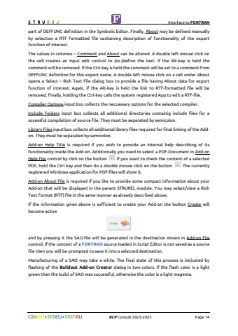 Interface to FORTRAN%uf09f %uf09f RCP Consult 2023-2025 Page 14part of DEFFUNC definition in the Symbolic Editor. Finally, About may be defined manually by selection a RTF formatted file containing description of functionality of the export function of interest. The values in columns %u2013 Comment and About can be altered. A double left mouse click on the cell creates an input edit control to (re-)define the text. If the Alt-key is held the comment will be removed. If the Ctrl-key is held the comment will be set to a comment from DEFFUNC definition for this export name. A double left mouse click on a cell under About opens a Select %u2013 Rich Text File dialog box to provide a file having About data for export function of interest. Again, if the Alt-key is held the link to RTF-formatted file will be removed. Finally, holding the Ctrl-key calls the system registered App to edit a RTF-file.Compiler Options input box collects the neccessary options for the selected compiler.Include Folders input box collects all additional directories containig include files for a sucessful compilation of source file. They must be separated by semicolon.Library Files input box collects all additional library files required for final linking of the Addon. They must be separated by semicolon.Add-on Help Title is required if you wish to provide an internal help describing of its functionality inside the Add-on. Additionally you need to select a PDF-Document in Add-on Help File control by click on the button . If you want to check the content of a selected PDF, hold the Ctrl key and then do a double mouse click on the button . The currently registered Windows application for PDF-files will show it. Add-on About File is required if you like to provide some compact information about your Add-on that will be displayed in the parent STRUREL module. You may select/view a Rich Text Format (RTF) file in the same manner as already described above. If the information given above is sufficient to create your Add-on the button Create will become activeand by pressing it the SAO-file will be generated in the destination shown in Add-on Filecontrol. If the content of a FORTRAN source loaded in Script Editor is not saved as a source file then you will be prompted to save it into a selected destination.Manufacturing of a SAO may take a while. The final state of this process is indicated by flashing of the Buildout Add-on Creator dialog in two colors. If the flash color is a light green then the build of SAO was successful, otherwise the color is a light magenta.