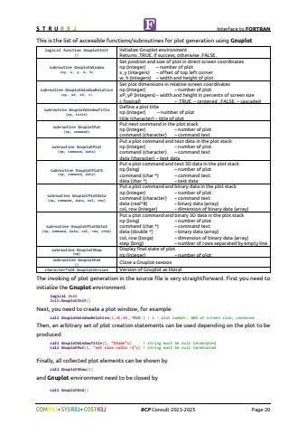 Interface to FORTRAN%uf09f %uf09f RCP Consult 2023-2025 Page 20This is the list of accessible functions/subroutines for plot generation using Gnuplotlogical function GnuplotInit()Initialize Gnuplot environmentReturns .TRUE. if success, otherwise .FALSE.subroutine GnuplotWindow(np, x, y, w, h)Set position and size of plot in direct screen coordinatesnp (integer) %u2013 number of plotx, y (integers) %u2013 offset of top left cornerw, h (integers) %u2013 width and height of plotsubroutine GnuplotWindowRelative(np, wP, hP, c)Set plot dimensions in relative screen coordinatesnp (integer) %u2013 number of plotxP, yP (integers) %u2013 width and height in percents of screen sizec (logical) %u2013 .TRUE. %u2013 centered, .FALSE. %u2013 cascadedsubroutine GnuplotWindowTitle(np, title)Define a plot titlenp (integer) %u2013 number of plottitle (character) %u2013 title of plotsubroutine GnuplotPut(np, command)Put next command in the plot stacknp (integer) %u2013 number of plotcommand (character) %u2013 command textsubroutine GnuplotPlot(np, command, data)Put a plot command and text data in the plot stacknp (integer) %u2013 number of plotcommand (character) %u2013 command textdata (character) %u2013 text datasubroutine GnuplotPlotS(np, command, data)Put a plot command and text 3D data in the plot stacknp (long) %u2013 number of plotcommand (char *) %u2013 command textdata (char *) %u2013 text datasubroutine GnuplotPlotData(np, command, data, col, row)Put a plot command and binary data in the plot stacknp (integer) %u2013 number of plotcommand (character) %u2013 command textdata (real*8) %u2013 binary data (array)col, row (integer) %u2013 dimension of binary data (array)subroutine GnuplotPlotDataS(np, command, data, col, row, step)Put a plot command and binary 3D data in the plot stacknp (long) %u2013 number of plotcommand (char *) %u2013 command textdata (double *) %u2013 binary data (array)col, row (longs) %u2013 dimension of binary data (array)step (long) %u2013 number of rows separated by empty linesubroutine GnuplotShow(np)Display final state of plotnp (integer) %u2013 number of plotsubroutine GnuplotEnd() Close a Gnuplot sessioncharacter*128 GnuplotVersion Version of Gnuplot as literalThe invoking of plot generation in the source file is very straightforward. First you need to initialize the Gnuplot environment logical Init Init=GnuplotInit()Next, you need to create a plot window, for example call GnuplotWindowRelative(1,40,40,.TRUE.) ! 1 %u2013 plot number, 40% of screen size, centeredThen, an arbitrary set of plot creation statements can be used depending on the plot to be produced call GnuplotWindowTitle(1, \ ! string must be null terminated call GnuplotPut(1, \! string must be null terminated...Finally, all collected plot elements can be shown by call GnuplotShow(1)and Gnuplot environment need to be closed by call GnuplotEnd()