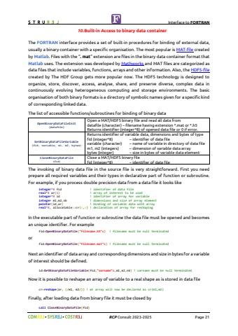 Interface to FORTRAN%uf09f %uf09f RCP Consult 2023-2025 Page 2110.Built-in Access to binary data containerThe FORTRAN interface provides a set of built-in procedures for binding of external data, usually a binary container with a specific organisation. The most popular is MAT-file created by Matlab. Files with the %u201c. mat%u201d extension are files in the binary data container format that Matlab uses. The extension was developed by Mathworks and MAT files are categorized as data files that include variables, functions, arrays and other information. Also, the HDF5-filecreated by The HDF Group gets more popular now. The HDF5 technology is designed to organize, store, discover, access, analyse, share, and preserve diverse, complex data in continuously evolving heterogeneous computing and storage environments. The basic organisation of both binary formats is a directory of symbolic names given for a specific kind of corresponding linked data.The list of accessible functions/subroutines for binding of binary dataOpenBinaryDataFileInit(datafile)Open a MAT/HDF5 binary file and read all data fromdatafile (character) %u2013 filename having extension *.mat or *.h5Returns identifier (integer*8) of opened data file or 0 if error.GetBinaryDataFileVariable(fid, variable, m1, m2, bytes)Returns identifier of variable data, dimensions and bytes of typefid (integer*8) %u2013 identifier of data filevariable (character) %u2013 name of variable in directory of data filem1, m2 (integers) %u2013 dimension of variable data arraybytes (integer) %u2013 size in bytes of variable data elementCloseBinaryDataFile(fid)Close a MAT/HDF5 binary filefid (integer*8) %u2013 identifier of data fileThe invoking of binary data file in the source file is very straightforward. First you need prepare all required variables and their types in declarative part of function or subroutine. For example, if you process double precision data from a data file it looks like integer*8 fid ! identifier of data file real*8 ar(1) ! array of interest to be used integer*8 id ! identifier of array for variable integer m1,m2,nb ! dimensions and size of array element pointer(id,ar) ! binding of variable data with array real*8, allocatable::cr(:,:) ! declaration of array for reshapingIn the executable part of function or subroutine the data file must be opened and becomes an unique identifier. For example fid=OpenBinaryDataFile(\! filename must be null terminatedor fid=OpenBinaryDataFile(\! filename must be null terminatedNext an identifier of data array and corresponding dimensions and size in bytes for a variable of interest should be defined. id=GetBinaryDataFileVariable(fid,\! varname must be null terminatedNow it is possible to reshape an array of variable to a real shape as is stored in data file cr=reshape(ar, (/m1, m2/)) ! cr array will now be declared as cr(m1,m2)Finally, after loading data from binary file it must be closed by call CloseBinaryDataFile(fid)
