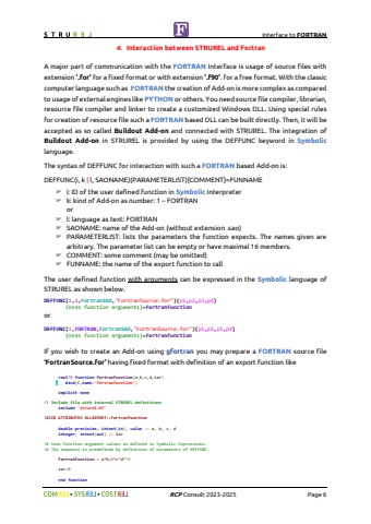 Interface to FORTRAN%uf09f %uf09f RCP Consult 2023-2025 Page 64. Interaction between STRUREL and FortranA major part of communication with the FORTRAN Interface is usage of source files with extension %u2019.for%u2019 for a fixed format or with extension %u2019.f90%u2019. for a free format. With the classic computer language such as FORTRAN the creation of Add-on is more complex as compared to usage of external engines like PYTHON or others. You need source file compiler, librarian, resource file compiler and linker to create a customized Windows DLL. Using special rules for creation of resource file such a FORTRAN based DLL can be built directly. Then, it will be accepted as so called Buildout Add-on and connected with STRUREL. The integration of Buildout Add-on in STRUREL is provided by using the DEFFUNC keyword in Symboliclanguage.The syntax of DEFFUNC for interaction with such a FORTRAN based Add-on is:DEFFUNC(i, k | l, SAONAME)(PARAMETERLIST){COMMENT}=FUNNAME%uf046 i: ID of the user defined function in Symbolic Interpreter%uf046 k: kind of Add-on as number: 1 %u2013 FORTRANor%uf046 l: language as text: FORTRAN%uf046 SAONAME: name of the Add-on (without extension .sao)%uf046 PARAMETERLIST: lists the parameters the function expects. The names given are arbitrary. The parameter list can be empty or have maximal 16 members.%uf046 COMMENT: some comment (may be omitted)%uf046 FUNNAME: the name of the export function to callThe user defined function with arguments can be expressed in the Symbolic language of STRUREL as shown below. DEFFUNC(1,1,FortranSAO,\ {Uses function arguments}=FortranFunctionorDEFFUNC(1,FORTRAN,FortranSAO,\ {Uses function arguments}=FortranFunctionIf you wish to create an Add-on using gfortran you may prepare a FORTRAN source file%u2018FortranSource.for%u2019 having fixed format with definition of an export function like real*8 function FortranFunction(a,b,c,d,ier) * bind(C,name='FortranFunction') implicit none!! Include file with internal STRUREL definitions include 'strurel.hf'!GCC$ ATTRIBUTES DLLEXPORT::FortranFunction double precision, intent(in), value :: a, b, c, d integer, intent(out) :: ier!# Uses function argument values as defined in Symbolic Expressions.!# The sequence is predefined by definition of parameters of DEFFUNC. FortranFunction = a*b/4*c*d**2 ier=0 end function