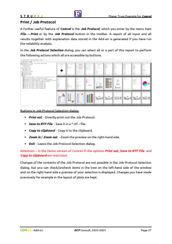 Planar Truss Examplefor ComrelAdd-onRCPConsult, 2023-2025Page 27Print / Job ProtocolA further useful feature ofComrelis the Job Protocol, which you enter by the menu item File%u2192Printor by the Job Protocol buttonin the toolbar. A report of all input and all results together with explanation data stored in the Add-on is generated if you have run the reliability analysis.In the Job Protocol Selection dialog, you can select all or a part of this report to perform the following actions which all are accessible by buttons.Buttons in Job Protocol Selection dialog:%u25aaPrint out-Directly print out the Job Protocol.%u25aaSave to RTF File-Save it in a *.rtf %u2013file.%u25aaCopy to clipboard-Copy it to the clipboard.%u25aaZoom in/ Zoom out-Zoom the preview on the right-hand side.%u25aaExit-Leave the Job Protocol Selection dialog.Attention %u2013in the Demo version of Comrel-TIthe options Printout, Save to RTF File andCopy to clipboard are restricted.Changes of the contents of the Job Protocol are not possible in the Job Protocol Selection dialog,but you can check/uncheck items in the tree onthe left-hand side of the window and onthe right-hand side a preview of your selection is displayed. Changes you have madepreviously for example in the layout of plots are kept.