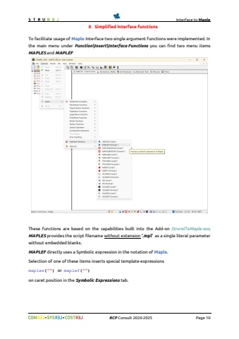 Interface to Maple%uf09f%uf09fRCPConsult2020-2025Page 109.Simplified interface functionsTo facilitate usage of MapleInterface two single argument functions were implemented. In the main menu under Function\\Insert\\InterfaceFunctions you can find two menu items MAPLESand MAPLEFThese functions are based on the capabilities built into the Add-on StrurelToMaple.sao. MAPLESprovides the script filename without extension%u2019.mpl%u2019as a single literal parameter without embedded blanks. MAPLEFdirectly uses a Symbolic expression inthenotation of Maple.Selection of one of these items inserts special template expressionsmaples(\or maplef(\on caret position intheSymbolic Expressionstab.