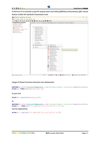 Interface to Maple%uf09f%uf09fRCPConsult2020-2025Page 11A shortcutistoactivatea specific popup menu by holdingCtrlkey and pressing right mouse button inside the Symbolic Expressions tab.Usage of these functionsshortens two statementsDEFFUNC(1,MAPLE,StrurelToMaple)(p1,p2){Standard Maple Interface}=MapleInterfaceFLIM(1)=FUNC(1)(\tojustoneFLIM(1)=maples(\orDEFFUNC(1,MAPLE,StrurelToMaple)(p1,p2){Standard MapleInterface}=MapleInterfaceFLIM(1)=FUNC(1)(\(RH/100)^5)/(10.65^5))^2.5\can be replaced by FLIM(1)=maplef(\