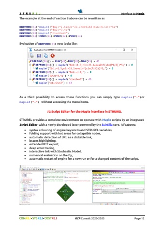 Interface to Maple%uf09f%uf09fRCPConsult2020-2025Page 12The exampleat the end of section 8above can be rewritten asDEFFUNC(41)=maplef(\DEFFUNC(42)=maplef(\DEFFUNC(43)=maplef(\DEFFUNC(44)=FUNC(41)+FUNC(42)+FUNC(43)Evaluation of DEFFUNC(44)now looks like:As a thirdpossibility to access these functions you can simply type maples(\maplef(\without accessing themenuitems.10.Script Editor for the Mapleinterface in STRURELSTRUREL provides a complete environment to operate with Maplescripts by an integrated ScriptEditorwith a newly developed lexer powered by the Scintillacore. It features:%u2022syntax colouring of engine keywords and STRUREL variables,%u2022folding support with hot areas forcollapsible nodes,%u2022automatic detection of URL as a clickable link,%u2022braces highlighting,%u2022extended RTF export,%u2022deep error tracing,%u2022interactive link with Stochastic Model,%u2022numerical evaluation on the fly,%u2022automatic restart of engine for a new run or for a changed content of the script.