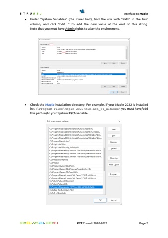 Interface to Maple%uf09f%uf09fRCPConsult2020-2025Page 2%u2022Under %u201cSystem Variables%u201d (the lower half), find the row with %u201cPath%u201d in the first column, and click %u201cEdit%u2026%u201dto add the new value at the end of this string. Note that you must have Adminrights to alter the environment.%u2022Checkthe Mapleinstallation directory. For example, if your Maple 2022is installed inC:\\ProgramFiles\\Maple2022\\bin.X86_64_WINDOWS\\you must have/addthis path in/to your System Pathvariable.