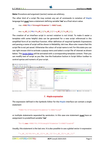 Interface to Maple%uf09f%uf09fRCPConsult2020-2025Page 6Note:Procedure and argument (vector)names are arbitrary.The other kind of a script file may contain any set of commands in notation of Maplelanguage but musthave a statement defining variable %u2019res%u2019as a final return value.res:=PAR1*Pi/4*Strength*Diameter^2-PAR2*Load;orres:=v_XP_[4]*Pi/4*v_XP_[2]*v_XP_[3]^2-v_XP_[5]*v_XP_[1];The creation of an interface script in correct notation is not trivial. To make it easier a template with some helpful data can be generated for a new script referenced in the simplifiedform of aninterface function. After definition of required Symbolic Expressions and parsing a name of script will be shown in Reliability Job tree. Blue color meansthat this script file is not yet saved. Otherwise thecolour of script name is red. For this state you can use right mouse click to activate a popup menu and select a script fileof interest as shown below. The Script Editorwill be activated with a corresponding template content. Then you can modify text of script as you like. Use the Evaluation button in Script Editor toolbar to controlsyntax and numericof yourscript.7.Maple expressionThe expression defined intheSymbolic Editor for the Mapleinterface can contain a single statement\PAR2*Load\or multiple statements separated by semicolon. In this case one statement musthave an assignment to predefined variable %u2019res%u2019\-PAR2*Load+A\Usually, this statement is thelast one. It is also possible to use a global vector in expression\_XP_[4]*Pi/4*v_XP_[2]*v_XP_[3]^2v_XP_[5]*v_XP_[1]\
