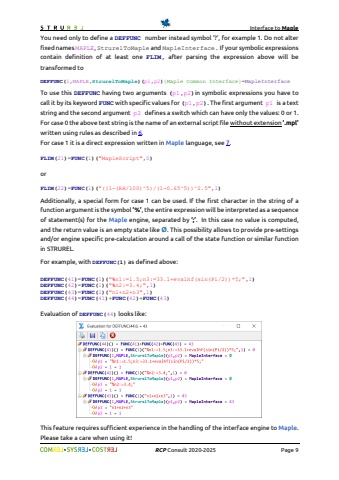 Interface to Maple%uf09f%uf09fRCPConsult2020-2025Page 9You need only to define a DEFFUNC number instead symbol %u2018?%u2019, for example 1. Do not alter fixed names MAPLE,StrurelToMapleand MapleInterface.If your symbolic expressions contain definition of at least one FLIM,after parsing the expression above will be transformed toDEFFUNC(1,MAPLE,StrurelToMaple)(p1,p2){Maple Common Interface}=MapleInterfaceTo use this DEFFUNChaving two arguments (p1,p2)in symbolic expressions youhaveto call it by its keyword FUNCwith specific values for (p1,p2). The first argumentp1 is a text string and the second argument p2 defines a switch which can have only thevalues: 0 or 1. For case0 the abovetext string is thename of an external script filewithout extension%u2019.mpl%u2019written using rules as describedin 6.For case 1it is a direct expression written in Maplelanguage, see 7.FLIM(21)=FUNC(1)(\or FLIM(22)=FUNC(1)(\Additionally, a special formfor case1can be used. If the firstcharacter in the string of a function argumentisthe symbol %u2019%%u2019, the entire expression will be interpreted as a sequence of statement(s)for the Mapleengine, separated by %u2019;%u2019.In this case no value is computed,and the return value is an empty state like %u00d8. This possibility allows to provide pre-settingsand/or engine specific pre-calculation around acall ofthestate function or similar function in STRUREL. For example,with DEFFUNC(1)as defined above:DEFFUNC(41)=FUNC(1)(\DEFFUNC(42)=FUNC(1)(\DEFFUNC(43)=FUNC(1)(\DEFFUNC(44)=FUNC(41)+FUNC(42)+FUNC(43)Evaluation of DEFFUNC(44)looks like:This feature requires sufficient experience in the handling oftheinterface enginetoMaple. Please take a care when using it!