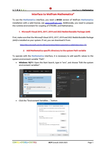 Interface to Mathematica%uf09f%uf09fRCPConsult2020-2025Page 1Interface to Wolfram Mathematica%u00aeTo use theMathematicainterface,you need a 64-bitversion of WolframMathematicainstallation with a valid license, see www.wolfram.com.Additionally, you need to preparetheruntime environment for coupling of STRURELand Mathematica.1.Microsoft Visual 2015, 2017, 2019and 2022 Redistributable Package (x64)First, make sure that the Microsoft Visual 2015, 2017, 2019 and 2022Redistributable Package (x64)is installed on your system. If not, you can download it from: https://docs.microsoft.com/enGB/cpp/windows/latestsupportedvcredist?view=msvc1702.Add Mathematicaspecific directoryto the system Path variableTo operate withtheMathematicainterface, it is necessary to add specific values to the system environment variable %u201cPath%u201d.%u2022Windows 10/11:Open the Start Search, type in %u201cenv%u201d, and choose %u201cEdit the system environment variables%u201d:%u2022Click the %u201cEnvironment Variables%u2026%u201d button.