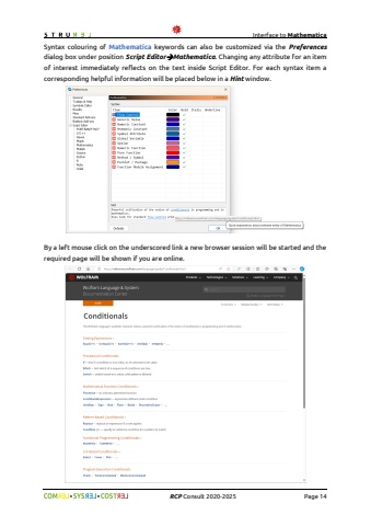 Interface to Mathematica%uf09f%uf09fRCPConsult2020-2025Page 14Syntax colouring of Mathematicakeywords can also be customized via the Preferencesdialog box under position Script Editor%u2192Mathematica. Changing any attribute for an item of interest immediately reflects on the text inside Script Editor. For each syntax item a corresponding helpful information will be placed below in a Hintwindow. By a left mouse click on the underscored link a new browser session will be started and the required page will be shown if you are online.