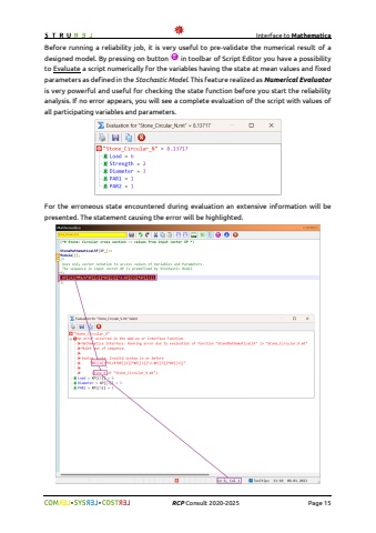 Interface to Mathematica%uf09f%uf09fRCPConsult2020-2025Page 15Before running a reliability job, it is very useful to prevalidate the numerical result of a designed model. By pressing on button in toolbar of Script Editor you have a possibility to Evaluatea script numerically for the variables having the state at mean values and fixed parameters as defined in the Stochastic Model. This feature realized as Numerical Evaluatoris very powerful and useful for checking the state function before you start the reliability analysis. If no error appears, you will see a complete evaluation of the script with values of all participating variables and parameters.Forthe erroneous state encountered during evaluation an extensive information will be presented. The statement causing the error will be highlighted.