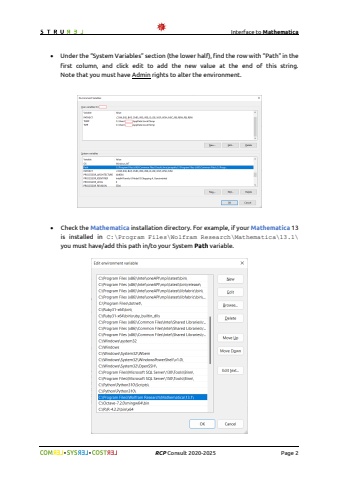 Interface to Mathematica%uf09f%uf09fRCPConsult2020-2025Page 2%u2022Under the %u201cSystem Variables%u201d section (the lower half), find the row with %u201cPath%u201d in the first column, and click editto add the new value at the end of this string. Note that you must have Adminrights to alter the environment.%u2022Checkthe Mathematicainstallation directory. For example, if your Mathematica13is installed inC:\\ProgramFiles\\WolframResearch\\Mathematica\\13.1\\you must have/addthis path in/to your System Pathvariable.