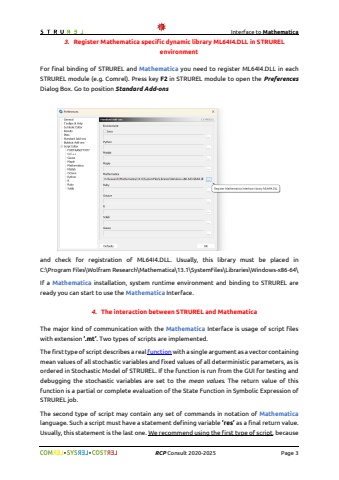 Interface to Mathematica%uf09f%uf09fRCPConsult2020-2025Page 33.RegisterMathematicaspecific dynamic library ML64I4.DLLin STRURELenvironmentFor final binding of STRURELand Mathematicayou need to registerML64I4.DLL in each STRURELmodule (e.g. Comrel).Press key F2inSTRURELmodule to open the PreferencesDialog Box. Go to position Standard Add-onsand check forregistration of ML64I4.DLL. Usually, this library must be placed in C:\\ProgramFiles\\WolframResearch\\Mathematica\\13.1\\SystemFiles\\Libraries\\Windows-x86-64\\If a Mathematicainstallation,system runtime environment and binding to STRURELare ready you can start to use the MathematicaInterface.4.The interaction between STRURELand MathematicaThe major kind of communication with theMathematicaInterface is usage of script fileswith extension %u2019.mt%u2019. Two types of scripts are implemented.The first typeof script describes a real functionwith a single argument as a vector containing mean values of all stochastic variables and fixed values of all deterministic parameters, as is ordered in Stochastic Model of STRUREL. If the functionis run from the GUI for testing and debugging the stochastic variables are set to the mean values. The return value of this functionis a partialor complete evaluation of theState Function in Symbolic Expression of STRURELjob.The second type of script may contain any set of commands in notation of Mathematicalanguage. Such a script must have a statement defining variable %u2019res%u2019 as a final return value. Usually, this statement is the last one. We recommend using thefirst type of script, because