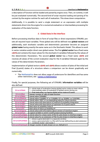 Interface to Mathematica%uf09f%uf09fRCPConsult2020-2025Page 4a description of functionwill be loaded and parsed by engine once. Then, on runtime, it will be just evaluated numerically. The second kind of script requires loading and parsing of its content by the engine runtime for each call of evaluation. This slows down computation.Additionally, it is possible to send a single statement or an expression with multiple statements direct into the engine for a numerical evaluation or intermediate processing for evaluation of the state function.5.Global Data in the InterfaceBefore processing interface data in form of script files or direct expressions STRUREL presets all required input variables. Three global sets will be defined: two global vectorsand additionally, each stochastic variable and deterministic parameter become an assigned global namehaving exactly the same name as in the Stochastic Model. This allows to work in vector notation and/or direct over global names. The first global vectorhas a fixed name s$XP$and contains the mean values for the stochastic X-variables followed by the values of the deterministic Parameters. The second global vectorhas a fixed name v$XP$and receives all values of the current evaluation step for the X-variables followed again by the values of the deterministic Parameters.Implementation of global vectors s$XP$and v$XP$allows creation of plots of the initial and final (%uf062-point) states of a structure where a comparison can be shown graphically and numerically.%uf046The Mathematicadoes not allow usage of underscore for identifiers and has some other restrictions, see -names in Mathematica.Finally, for special purposes, the following set of STRUREL information variableswill be also defined: StrurelMode0 %u2013initial state ofevaluation having global vector state as mean values1 %u2013intermediate state of evaluation of global vector during run2 %u2013final state after runhaving global vector state at %u00df-pointStrurelRunInteger counter of calls of state functionStrurelNameLiteral value %u2018STRUREL%u2019StrurelModuleLiteral value %u2018COMREL-TI%u2019 or %u2018COMREL-TV%u2019 or %u2018SYSREL%u2019 or %u2018COSTREL%u2019StrurelVersionLiteral value %u20182025%u2019 or corresponding value for future versionsStrurelIMETLiteral value with description of method of probaility integrationStrurelIOPTLiteral value with description of optimizer for %u00dfpoint searchStrurelBetaReal value of reliability index %u00dfStrurelPfReal value of failure probability PfStrurelEngineLiteral value with information about version of interface engineStrurelPlotLogical variable to switch on/off postprocessing facilitiesStrurelPlotNameLiteral value for a base name of file for plot drawn in interface engineStrurelPlotTypeLiteral value for an extension of file for plot drawn in interface engineStrurelPlotMode1 %u2013shows a generated plot in a separate window2 %u2013saves a generated plot in a file with format defined by an plot extension3 %u2013combines mode 1 and mode 2StrurelPlotCountInteger counter of plots drawn on run. Default is 0
