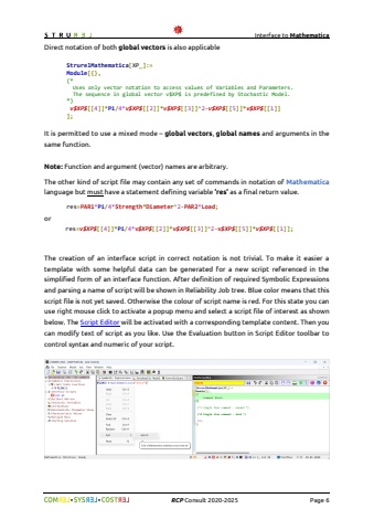 Interface to Mathematica%uf09f%uf09fRCPConsult2020-2025Page 6Direct notation of both global vectorsis also applicableStrurelMathematica[XP_]:=Module[{},(*Uses only vector notation to access values of Variables and Parameters.The sequence in globalvector v$XP$is predefined by Stochastic Model.*)v$XP$[[4]]*Pi/4*v$XP$[[2]]*v$XP$[[3]]^2-v$XP$[[5]]*v$XP$[[1]]];It is permitted to use a mixed mode %u2013global vectors, global namesand arguments in the same function.Note:Functionand argument (vector)names are arbitrary.The other kind of script file may contain any set of commands in notation of Mathematicalanguage but musthave a statement defining variable %u2019res%u2019as a final return value.res=PAR1*Pi/4*Strength*Diameter^2-PAR2*Load;orres=v$XP$[[4]]*Pi/4*v$XP$[[2]]*v$XP$[[3]]^2-v$XP$[[5]]*v$XP$[[1]];The creation of an interface script in correct notation is not trivial. To make it easier a template with some helpful data can be generated for a new script referenced in the simplified form of an interface function. After definition of required Symbolic Expressions and parsing a name of script will be shown in Reliability Job tree. Blue color means that this script file is not yet saved. Otherwise the colour of script name is red. For this state you can use right mouse click to activate a popup menu and select a script file of interest as shown below. The Script Editorwill be activated with a corresponding template content. Then you can modify text of script as you like. Use the Evaluation button in Script Editor toolbar to control syntax and numeric of your script.