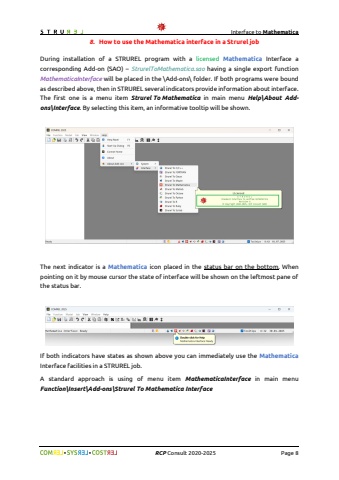 Interface to Mathematica%uf09f%uf09fRCPConsult2020-2025Page 88.How to use theMathematicainterface in a Strurel jobDuringinstallation of a STRURELprogramwith a licensedMathematicaInterface a corresponding Add-on (SAO) %u2013StrurelToMathematica.saohaving a single export function MathematicaInterfacewill be placed in the \\Addons\\folder.If both programs were bound as described above,then in STRURELseveral indicators provide information about interface. The first one is a menu item StrurelToMathematicain main menu Help\\About Addons\\Interface. By selecting this item, an informative tooltip will be shown.The nextindicator is a Mathematicaicon placed in the status bar on the bottom. When pointing on it by mouse cursor the state of interface will be shown on the leftmost pane of the status bar.If both indicators have states as shown above you can immediately use the MathematicaInterface facilities in a STRURELjob.Astandard approach is using ofmenuitem MathematicaInterfacein main menu Function\\Insert\\Add-ons\\StrurelToMathematicaInterface