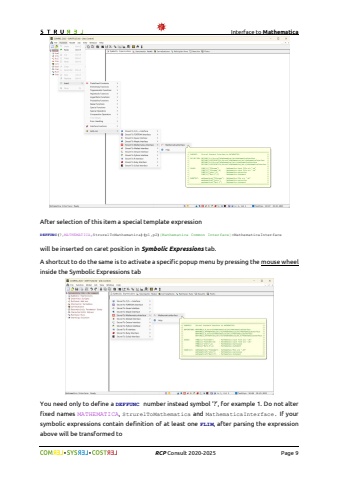 Interface to Mathematica%uf09f%uf09fRCPConsult2020-2025Page 9After selection of this item a special template expressionDEFFUNC(?,MATHEMATICA,StrurelToMathematica)(p1,p2){Mathematica Common Interface}=MathematicaInterfacewill be inserted on caret position in Symbolic Expressionstab.A shortcut to do the same is to activate a specific popup menu by pressing the mouse wheelinside the Symbolic Expressions tabYou need only to define a DEFFUNCnumber instead symbol %u2018?%u2019, for example 1. Do not alter fixed names MATHEMATICA,StrurelToMathematicaand MathematicaInterface.If your symbolic expressions contain definition of at least oneFLIM, after parsing the expression above will be transformed to