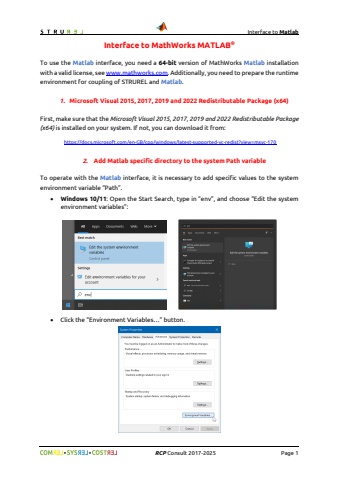 Interface to Matlab%uf09f%uf09fRCPConsult2017-2025Page 1Interface to MathWorksMATLAB%u00aeTo use theMatlabinterface,you need a 64-bitversion of MathWorksMatlabinstallation with a valid license, see www.mathworks.com.Additionally, you need to preparetheruntime environment for coupling of STRURELand Matlab.1.Microsoft Visual 2015, 2017, 2019and 2022 Redistributable Package (x64)First, make sure that the Microsoft Visual 2015, 2017, 2019 and 2022Redistributable Package (x64)is installed on your system. If not, you can download it from: https://docs.microsoft.com/enGB/cpp/windows/latestsupportedvcredist?view=msvc1702.Add Matlabspecific directoryto the system Path variableTo operate withtheMatlabinterface, it is necessary to add specific values to the system environment variable %u201cPath%u201d.%u2022Windows 10/11:Open the Start Search, type in %u201cenv%u201d, and choose %u201cEdit the system environment variables%u201d:%u2022Click the %u201cEnvironment Variables%u2026%u201d button.