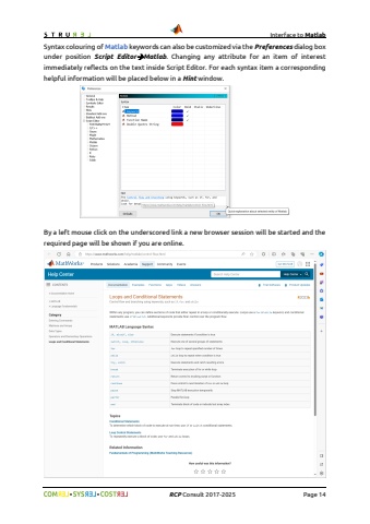 Interface to Matlab%uf09f%uf09fRCPConsult2017-2025Page 14Syntax colouring of Matlabkeywords can also be customized via the Preferencesdialog box under position Script Editor%u2192Matlab. Changing any attribute for an item of interest immediately reflects on the text inside Script Editor. For each syntax item a corresponding helpful information will be placed below in a Hintwindow. By a left mouse click on the underscored link a new browser session will be started and the required page will be shown if you are online.