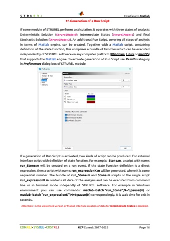 Interface to Matlab%uf09f%uf09fRCPConsult2017-2025Page 1611.Generation of a Run ScriptIf some module of STRUREL performs a calculation, it operates with three states of analysis: Deterministic Solution (StrurelMode=0), Intermediate States (StrurelMode=1) and final Stochastic Solution (StrurelMode=2). An additional Run Script, covering all steps of analysis in terms of Matlabengine, can be created. Together with a Matlabscript, containing definition of the state function, this comprises a bundle of two files which can be executed independently of STRUREL software on any computer platform (Windows, Linuxor macOS) that supports the Matlabengine. To activate generation of Run Script use Resultscategory in Preferencesdialog box of STRUREL module.If a generation of Run Script is activated, two kinds of script can be produced. For external interface script with definition of state function, for example: Stone.m, a script with name: run_Stone.mwill be created on a run event. If the state function definition is a direct expression, then a script with name: run_expressionK.mwill be generated, where K is some sequential number. The bundle of run_Stone.mand Stone.mscripts or the single script run_expressionK.mcontains all data of the analysis and can be executed from command line or in terminal mode independly of STRUREL software. For example in Windows environment you can use commands: matlab-batch\_Stone\or matlab-batch\_expressionK\seconds.Attention: in the unlicensed version of MatlabInterface creation of data for Intermediate Statesis disabled.