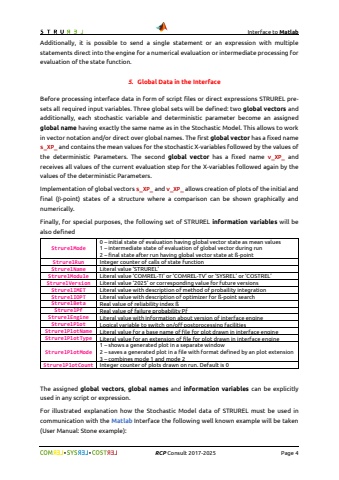 Interface to Matlab%uf09f%uf09fRCPConsult2017-2025Page 4Additionally, it is possible to send a single statement or an expression with multiple statements direct into the engine for a numerical evaluation or intermediate processing for evaluation of the state function.5.Global Data in the InterfaceBefore processing interface data in form of script files or direct expressions STRUREL presets all required input variables. Three global sets will be defined: two global vectorsand additionally, each stochastic variable and deterministic parameter become an assigned global namehaving exactly the same name as in the Stochastic Model. This allows to work in vector notation and/or direct over global names. The first global vectorhas a fixed name s_XP_and contains the mean values for the stochastic X-variables followed by the values of the deterministic Parameters. The second global vectorhas a fixed name v_XP_and receives all values of the current evaluation step for the X-variables followed again by the values of the deterministic Parameters.Implementation of global vectors s_XP_and v_XP_allows creation of plots of the initial and final (%uf062-point) states of a structure where a comparison can be shown graphically and numerically.Finally, for special purposes, the following set of STRUREL information variableswill be also definedStrurelMode0 %u2013initial state ofevaluation having global vector state as mean values1 intermediate state of evaluation of global vector during run2 %u2013final state after runhaving global vector state at %u00df-pointStrurelRunInteger counter of calls of state functionStrurelNameLiteral value %u2018STRUREL%u2019StrurelModuleLiteral value %u2018COMRELTI%u2019 or %u2018COMRELTV%u2019 or %u2018SYSREL%u2019 or %u2018COSTREL%u2019StrurelVersionLiteral value %u20182025%u2019 or corresponding value for future versionsStrurelIMETLiteral value with description of method of probaility integrationStrurelIOPTLiteral value with description of optimizer for %u00df-point searchStrurelBetaReal value of reliability index %u00dfStrurelPfReal value of failure probability PfStrurelEngineLiteral value with information about version of interface engineStrurelPlotLogical variable to switch on/off postprocessing facilitiesStrurelPlotNameLiteral value for a base name of file for plot drawn in interface engineStrurelPlotTypeLiteral value for an extension of file for plot drawn in interface engineStrurelPlotMode1 shows a generated plot in a separate window2 %u2013saves a generated plot in a file with format defined by an plot extension3 combines mode 1 and mode 2StrurelPlotCountInteger counter of plots drawn on run. Default is 0The assigned global vectors, global namesand information variables can be explicitly used in any script or expression.For illustrated explanation how theStochastic Model data of STRURELmust be used in communication with theMatlabInterfacethe following well known example will be taken (User Manual: Stone example):