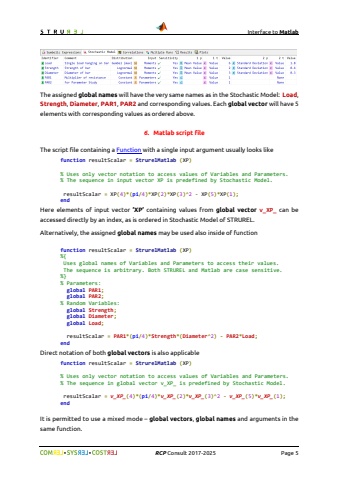 Interface to Matlab%uf09f%uf09fRCPConsult2017-2025Page 5The assigned global nameswill have the very same names as in the Stochastic Model: Load, Strength, Diameter, PAR1, PAR2and corresponding values. Each global vectorwill have 5 elements with corresponding values as ordered above.6.Matlabscript fileThe script file containing a Functionwith a single input argument usually looks likefunctionresultScalar =StrurelMatlab(XP)% Uses only vector notation to access values of Variables and Parameters.% The sequence in input vector XP is predefined by Stochastic Model.resultScalar =XP(4)*(pi/4)*XP(2)*XP(3)^2-XP(5)*XP(1);endHere elements of input vector %u2019XP%u2019containing values from global vectorv_XP_can be accessed directly by an index, as is ordered in Stochastic Model of STRUREL.Alternatively, the assigned global namesmay be used also inside of functionfunctionresultScalar =StrurelMatlab(XP)%{Uses global names of Variables and Parameters to access their values.The sequence is arbitrary. Both STRUREL and Matlabare case sensitive.%}% Parameters:globalPAR1;globalPAR2;% Random Variables:globalStrength;globalDiameter;globalLoad;resultScalar =PAR1*(pi/4)*Strength*(Diameter^2)-PAR2*Load;endDirect notation of both global vectorsis also applicablefunctionresultScalar =StrurelMatlab(XP)% Uses only vector notation to access values of Variables and Parameters.% The sequence in globalvector v_XP_is predefined by Stochastic Model.resultScalar =v_XP_(4)*(pi/4)*v_XP_(2)*v_XP_(3)^2-v_XP_(5)*v_XP_(1);endIt is permitted to use a mixed mode %u2013global vectors, global namesand arguments in the same function.