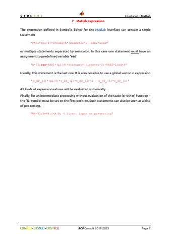 Interface to Matlab%uf09f%uf09fRCPConsult2017-2025Page 77.MatlabexpressionThe expression defined in Symbolic Editor for the Matlabinterface can contain a single statement\PAR2*Load\or multiple statements separated by semicolon. In this case one statement musthave an assignment to predefined variable %u2019res%u2019\-PAR2*Load+A\Usually, this statement is thelast one.It is also possible to use a global vector in expression\_XP_(4)*(pi/4)*v_XP_(2)*v_XP_(3)^2 -v_XP_(5)*v_XP_(1)\All kinds of expressions above will be evaluated numerically. Finally, for an intermediate processing without evaluation of the state (or other) function %u2013the %u2019%%u2019 symbol must be set on the first position. Such statements can also be seen as a kind of pre-setting.\% Direct inputas presetting\