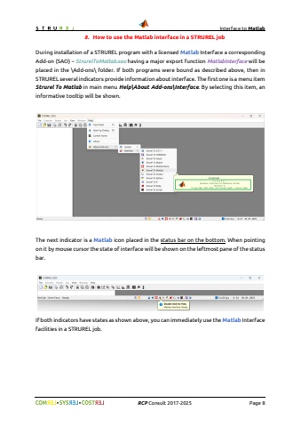 Interface to Matlab%uf09f%uf09fRCPConsult2017-2025Page 88.How to use theMatlabinterface in a STRURELjobDuringinstallation of a STRURELprogramwith a licensed MatlabInterface a corresponding Add-on (SAO) %u2013StrurelToMatlab.saohaving a majorexport function MatlabInterfacewill be placed in the \\Addons\\folder.If both programs were bound as described above,then in STRURELseveral indicators provide information about interface. The first one is a menu item StrurelToMatlabin main menu Help\\About Add-ons\\Interface. By selecting this item, an informative tooltip will be shown.The nextindicator is a Matlabicon placed in the status bar on the bottom. When pointingonit by mouse cursor the state of interface will be shown on the leftmost pane of the status bar.If both indicators have states as shown above,you can immediately use the MatlabInterface facilities in a STRURELjob.