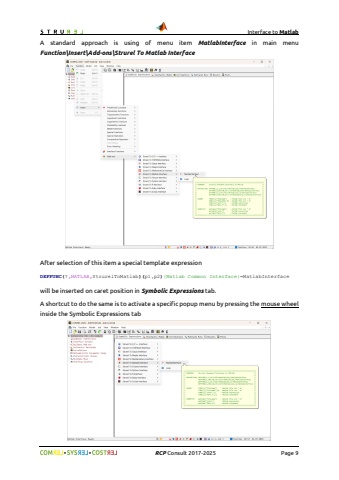 Interface to Matlab%uf09f%uf09fRCPConsult2017-2025Page 9Astandard approach is using ofmenuitem MatlabInterfacein main menu Function\\Insert\\Add-ons\\StrurelToMatlabInterfaceAfter selection of this item a special template expressionDEFFUNC(?,MATLAB,StrurelToMatlab)(p1,p2){Matlab Common Interface}=MatlabInterfacewill be inserted on caret position in Symbolic Expressionstab.A shortcut to do the same is to activate a specific popup menu by pressing the mouse wheelinside the Symbolic Expressions tab
