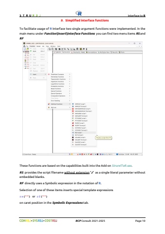 Interface to R%uf09f%uf09fRCPConsult2021-2025Page 109.Simplified interface functionsTo facilitate usage of RInterface twosingle argument functions were implemented.In the main menu under Function\\Insert\\InterfaceFunctionsyou can findtwo menu itemsRSandRFThese functions are based on the capabilities built into the Add-on StrurelToR.sao.RSprovides the script filename without extension%u2019.r%u2019as a single literal parameter without embedded blanks. RFdirectly uses a Symbolic expression in the notation of R. Selection of one of these items inserts special template expressionsrs(\on caret position in the Symbolic Expressionstab.