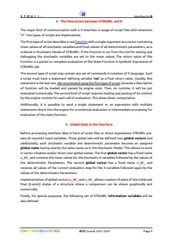 Interface to R%uf09f%uf09fRCPConsult2021-2025Page 44.The interaction between STRURELand RThe major kind of communication with a RInterface is usage of script fileswith extension %u2019.r%u2019. Two types of scripts are implemented.The first typeof script describes a real functionwith a single argument as a vector containing mean values of all stochastic variables and fixed values of all deterministic parameters, as is ordered in Stochastic Model of STRUREL. If the functionis run from the GUI for testing and debugging the stochastic variables are set to the mean values. The return value of this functionis a partialor complete evaluation of theState Function in Symbolic Expression of STRURELjob.The second type of script may contain any set of commands in notation of Rlanguage. Such a script must have a statement defining variable %u2019res%u2019 as a final return value. Usually, this statement is the last one. We recommend using thefirst type of script, because a description of functionwill be loaded and parsed by engine once. Then, on runtime, it will be just evaluated numerically. The second kind of script requires loading and parsing of its content by the engine runtime for each call of evaluation. This slows down computation.Additionally, it is possible to send a single statement or an expression with multiple statements direct into the engine for a numerical evaluation or intermediate processing for evaluation of the state function.5.Global Data in the InterfaceBefore processing interface data in form of script files or direct expressions STRUREL presets all required input variables. Three global sets will be defined: two global vectorsand additionally, each stochastic variable and deterministic parameter become an assigned global namehaving exactly the same name as in the Stochastic Model. This allows to work in vector notation and/or direct over global names. The first global vectorhas a fixed name s_XP_and contains the mean values for the stochastic X-variables followed by the values of the deterministic Parameters. The second global vectorhas a fixed name v_XP_and receives all values of the current evaluation step for the X-variables followed again by the values of the deterministic Parameters.Implementation of global vectors s_XP_and v_XP_allows creation of plots of the initial and final (%uf062-point) states of a structure where a comparison can be shown graphically and numerically.Finally, for special purposes, the following set of STRUREL information variableswill be also defined