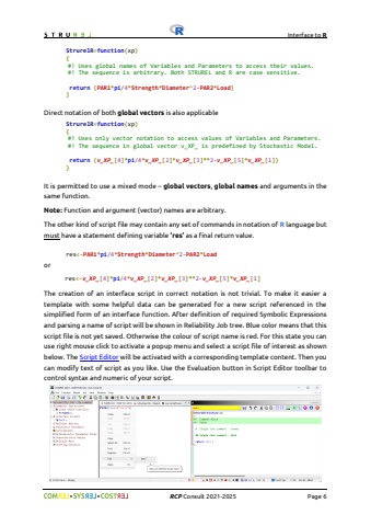 Interface to R%uf09f%uf09fRCPConsult2021-2025Page 6StrurelR=function(xp){#! Uses global names of Variables and Parameters to access their values.#! The sequence is arbitrary. Both STRUREL and R are case sensitive.return(PAR1*pi/4*Strength*Diameter^2-PAR2*Load)}Direct notation of both global vectorsis also applicableStrurelR=function(xp){#! Uses only vector notation to access values of Variables and Parameters.#! The sequence in global vector v_XP_ is predefined by Stochastic Model.return(v_XP_[4]*pi/4*v_XP_[2]*v_XP_[3]**2-v_XP_[5]*v_XP_[1])}It is permitted to use a mixed mode %u2013global vectors, global namesand arguments in the same function.Note:Functionand argument (vector)names are arbitrary.The other kind of script file may contain any set of commands in notation of Rlanguage but musthave a statement defining variable %u2019res%u2019as a final return value.res<-PAR1*pi/4*Strength*Diameter^2-PAR2*Loadorres<-v_XP_[4]*pi/4*v_XP_[2]*v_XP_[3]**2-v_XP_[5]*v_XP_[1]The creation of an interface script in correct notation is not trivial. To make it easier a template with some helpful data can be generated for a new script referenced in the simplified form of an interface function. After definition of required Symbolic Expressions and parsing a name of script will be shown in Reliability Job tree. Blue color means that this script file is not yet saved. Otherwise the colour of script name is red. For this state you can use right mouse click to activate a popup menu and select a script file of interest as shown below. The Script Editorwill be activated with a corresponding template content. Then you can modify text of script as you like. Use the Evaluation button in Script Editor toolbar to control syntax and numeric of your script.