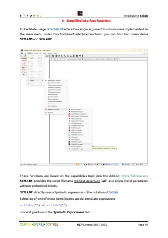 Interface to Scilab%uf09f%uf09fRCPConsult2021-2025Page 109.Simplified interface functionsTo facilitate usage of ScilabInterface two single argument functions were implemented. In the main menu under Function\\Insert\\InterfaceFunctionsyou can find two menu items SCILABSand SCILABFThese functions are based on the capabilities built into the Add-on StrurelToScilab.sao. SCILABSprovides the script filename without extension%u2019.sci%u2019as a single literal parameter without embedded blanks. SCILABFdirectly uses a Symbolic expression in the notation of Scilab. Selection of one of these items inserts special template expressionsscilabs(\on caret position in the Symbolic Expressionstab.
