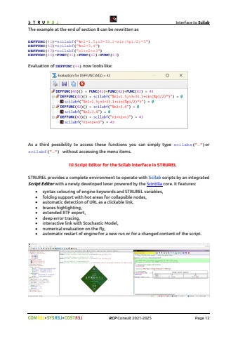 Interface to Scilab%uf09f%uf09fRCPConsult2021-2025Page 12The exampleat the end of section 8can be rewritten asDEFFUNC(41)=scilabf(\DEFFUNC(42)=scilabf(\DEFFUNC(43)=scilabf(\DEFFUNC(44)=FUNC(41)+FUNC(42)+FUNC(43)Evaluation of DEFFUNC(44)now looks like:As a thirdpossibility to access these functions you can simply type scilabs(\scilabf(\without accessing the menu items.10.Script Editor for the Scilabinterface in STRURELSTRUREL provides a complete environment to operate with Scilabscripts by an integrated ScriptEditorwith a newly developed lexer powered by the Scintillacore. It features:%u2022syntax colouring of engine keywords and STRUREL variables,%u2022folding support with hot areas forcollapsible nodes,%u2022automatic detection of URL as a clickable link,%u2022braces highlighting,%u2022extended RTF export,%u2022deep error tracing,%u2022interactive link with Stochastic Model,%u2022numerical evaluation on the fly,%u2022automatic restart of engine for a new run or for a changed content of the script.