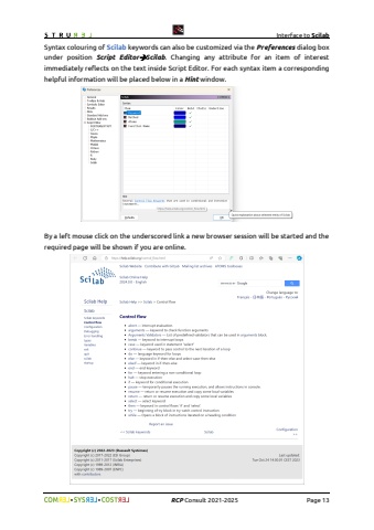 Interface to Scilab%uf09f%uf09fRCPConsult2021-2025Page 13Syntax colouring of Scilabkeywords can also be customized via the Preferencesdialog box under position Script Editor%u2192Scilab. Changing any attribute for an item of interest immediately reflects on the text inside Script Editor. For each syntax item a corresponding helpful information will be placed below in a Hintwindow. By a left mouse click on the underscored link a new browser session will be started and the required page will be shown if you are online.