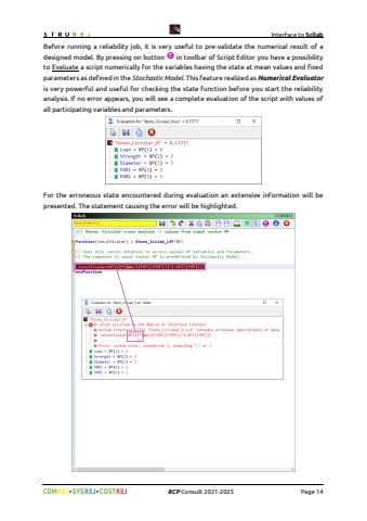 Interface to Scilab%uf09f%uf09fRCPConsult2021-2025Page 14Before running a reliability job, it is very useful to prevalidate the numerical result of a designed model. By pressing on button in toolbar of Script Editor you have a possibility to Evaluatea script numerically for the variables having the state at mean values and fixed parameters as defined in the Stochastic Model. This feature realized as Numerical Evaluatoris very powerful and useful for checking the state function before you start the reliability analysis. If no error appears, you will see a complete evaluation of the script with values of all participating variables and parameters.Forthe erroneous state encountered during evaluation an extensive information will be presented. The statement causing the error will be highlighted.