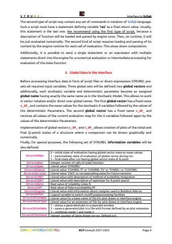 Interface to Scilab%uf09f%uf09fRCPConsult2021-2025Page 4The second type of script may contain any set of commands in notation of Scilablanguage. Such a script must have a statement defining variable %u2019res%u2019 as a final return value. Usually, this statement is the last one. We recommend using thefirst type of script, because a description of functionwill be loaded and parsed by engine once. Then, on runtime, it will be just evaluated numerically. The second kind of script requires loading and parsing of its content by the engine runtime for each call of evaluation. This slows down computation.Additionally, it is possible to send a single statement or an expression with multiple statements direct into the engine for a numerical evaluation or intermediate processing for evaluation of the state function.5.Global Data in the InterfaceBefore processing interface data in form of script files or direct expressions STRUREL presets all required input variables. Three global sets will be defined: two global vectorsand additionally, each stochastic variable and deterministic parameter become an assigned global namehaving exactly the same name as in the Stochastic Model. This allows to work in vector notation and/or direct over global names. The first global vectorhas a fixed name s_XP_and contains the mean values for the stochastic X-variables followed by the values of the deterministic Parameters. The second global vectorhas a fixed name v_XP_and receives all values of the current evaluation step for the X-variables followed again by the values of the deterministic Parameters.Implementation of global vectors s_XP_and v_XP_allows creation of plots of the initial and final (%uf062-point) states of a structure where a comparison can be shown graphically and numerically.Finally, for special purposes, the following set of STRUREL information variableswill be also defined: StrurelMode0 %u2013initial state ofevaluation having global vector state as mean values1 intermediate state of evaluation of global vector during run2 %u2013final state after runhaving global vector state at %u00df-pointStrurelRunInteger counter of calls of state functionStrurelNameLiteral value %u2018STRUREL%u2019StrurelModuleLiteral value %u2018COMRELTI%u2019 or %u2018COMRELTV%u2019 or %u2018SYSREL%u2019 or %u2018COSTREL%u2019StrurelVersionLiteral value %u20182025%u2019 or corresponding value for future versionsStrurelIMETLiteral value with description of method of probaility integrationStrurelIOPTLiteral value with description of optimizer for %u00df-point searchStrurelBetaReal value of reliability index %u00dfStrurelPfReal value of failure probability PfStrurelEngineLiteral value with information about compiler used in Buildout Add-onStrurelPlotLogical variable to switch on/off postprocessing facilitiesStrurelPlotNameLiteral value for a base name of file for plot drawn in interface engineStrurelPlotTypeLiteral value for an extension of file for plot drawn in interface engineStrurelPlotMode1 shows a generated plot in a separate window2 %u2013saves a generated plot in a file with format defined by an plot extension3 combines mode 1 and mode 2StrurelPlotCountInteger counter of plots drawn on run. Default is 0