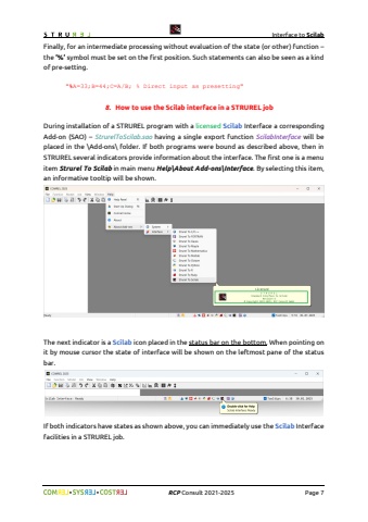 Interface to Scilab%uf09f%uf09fRCPConsult2021-2025Page 7Finally, for an intermediate processing without evaluation of the state (or other) function the %u2019%%u2019 symbol must be set on the first position. Such statements can also be seen as a kind of pre-setting.\% Direct inputas presetting\8.How to use theScilabinterface in a STRURELjobDuringinstallation of a STRURELprogramwith a licensedScilabInterface a corresponding Add-on (SAO) %u2013StrurelToScilab.saohaving a single export function ScilabInterfacewill be placed in the \\Addons\\folder.If both programs were bound as described above, then in STRUREL several indicators provide information about the interface. The first one is a menu item Strurel To Scilabin main menu Help\\About Add-ons\\Interface. By selecting this item, an informative tooltip will be shown.The next indicator is a Scilabicon placed in the status bar on the bottom. When pointing on it by mouse cursor the state of interface will be shown on the leftmost pane of the status bar.If both indicators have states as shown above,you can immediately use the ScilabInterface facilities in a STRURELjob.