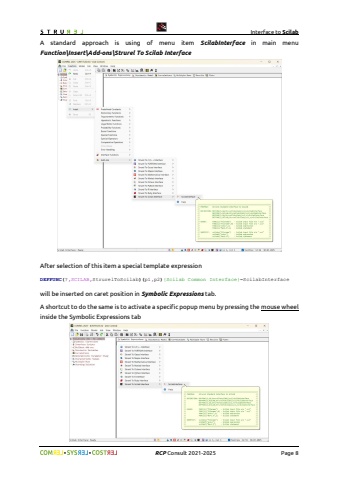 Interface to Scilab%uf09f%uf09fRCPConsult2021-2025Page 8Astandard approach is using ofmenuitem ScilabInterfacein main menu Function\\Insert\\Add-ons\\StrurelToScilabInterfaceAfter selection of this item a special template expressionDEFFUNC(?,SCILAB,StrurelToScilab)(p1,p2){ScilabCommon Interface}=ScilabInterfacewill be inserted on caret position in Symbolic Expressionstab.A shortcut to do the same is to activate a specific popup menu by pressing the mouse wheelinside the Symbolic Expressions tab